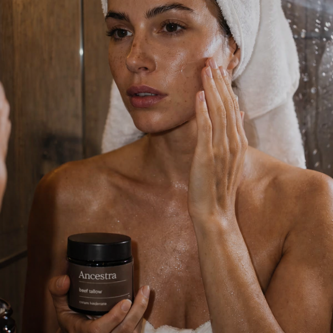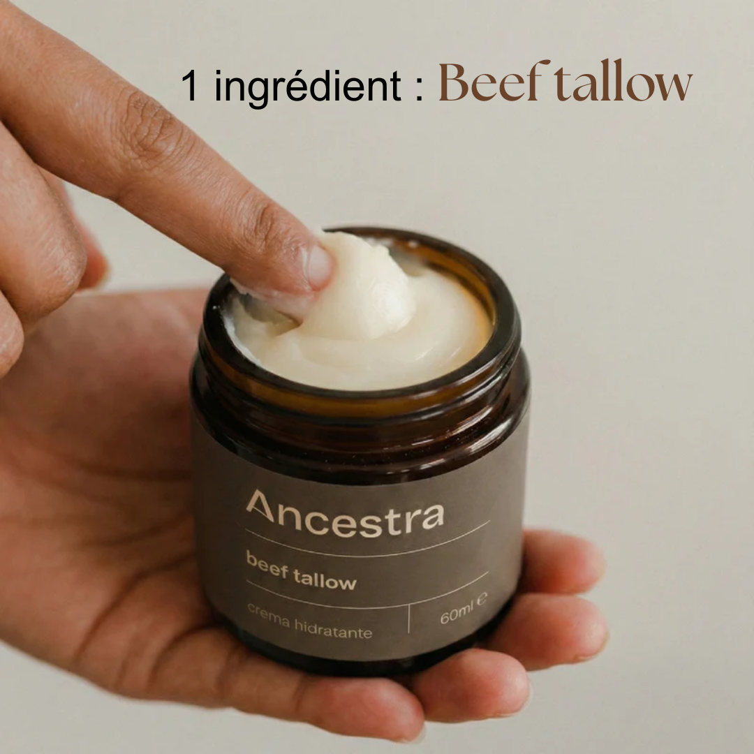 La crème Ancestra est un soin régénérant et hydratant formulé avec un seul ingrédient : beef tallow (suif de bœuf) 100 % pur, une graisse biocompatible avec la peau humaine.